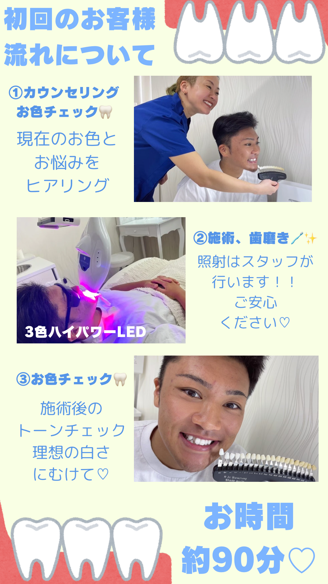 ※2,3来店して照射をしても歯のトーンが上がらない時期のことを呼んでおります。若い方に多いです。統計的には何来店目かで問題なくトーンが上がることが多いです。